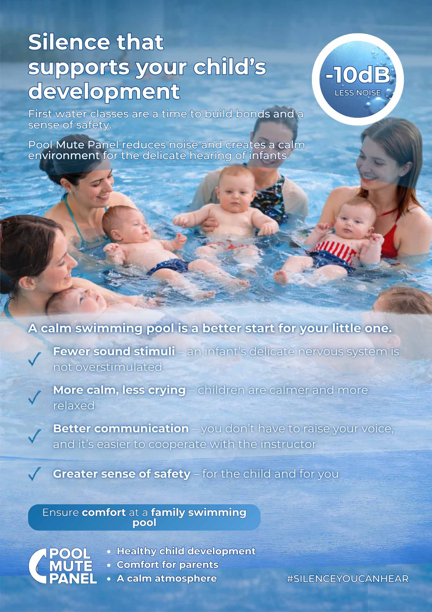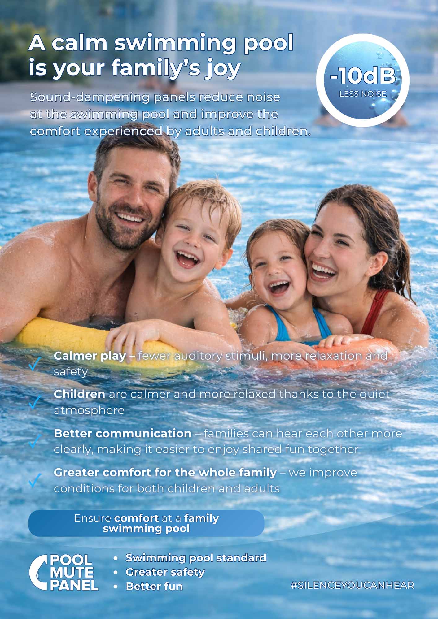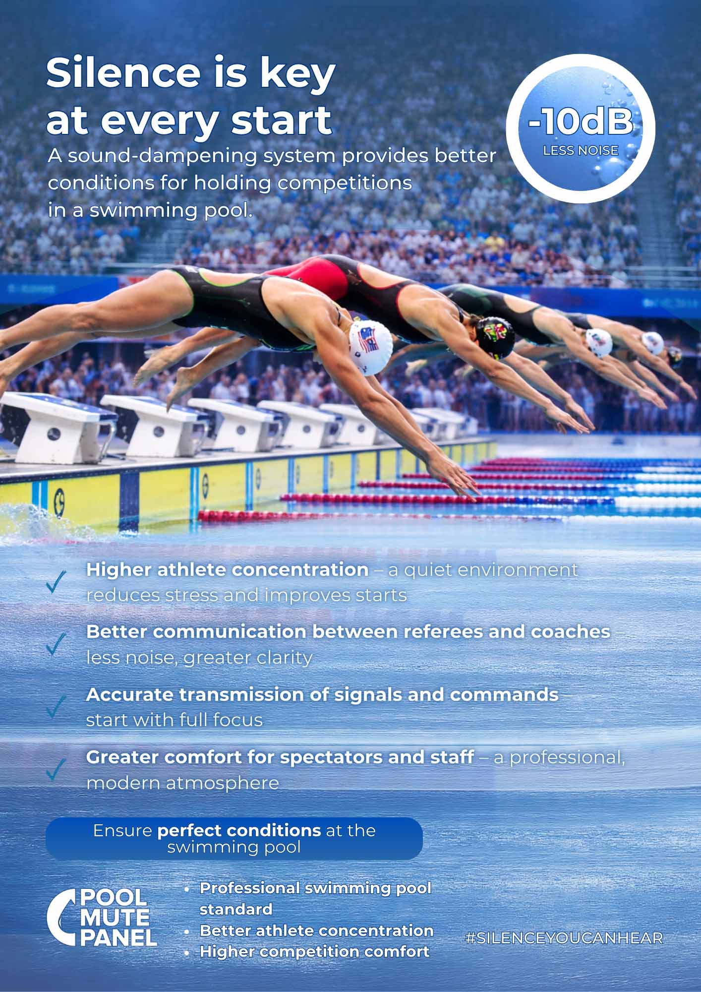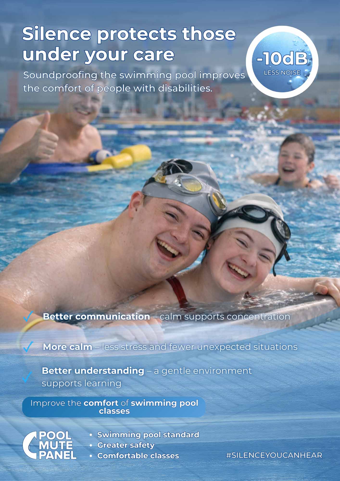 The Pool Mute Panel system supports the management of modern swimming pool facilities by improving working conditions, customer comfort, and the acoustic standard of the space.